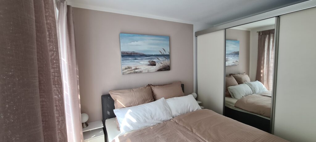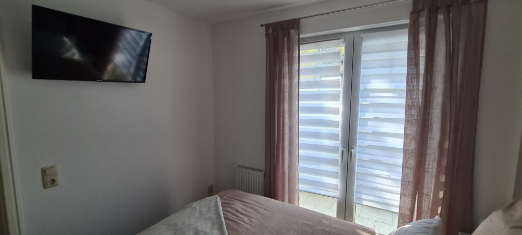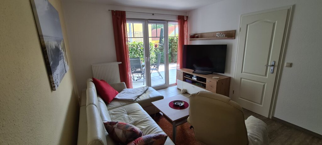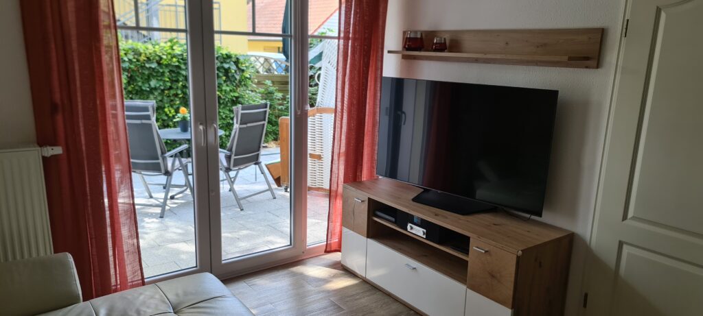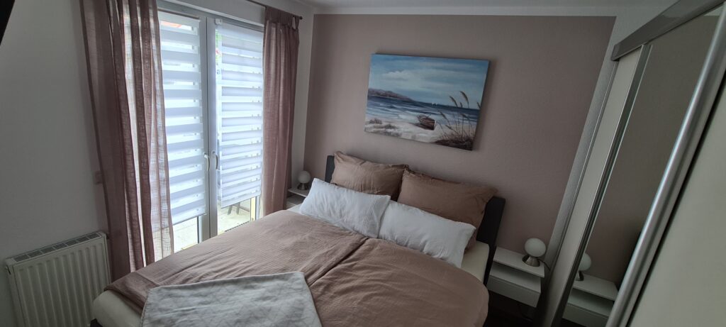 Erholung vom Sonnenbad, einer Wanderung ins benachbarte Göhren / Sellin oder einem Inselausflug per Rad / Auto / Bäderbahn finden Sie im angrenzendem Schlafzimmer mit Terrassenzugang. Das Schlafzimmer ist mit einem Comfort-Doppelbett (1,60 x 2,00 m mit Bettkasten), einem großen Schwebetürenschrank und 2 Nachttischen mit Beleuchtung ausgestattet. Bügelbrett, Bügeleisen und Wäscheständer finden Sie im Schlafzimmerschrank. Als Rückzugsort hat das Zimmer ein zweites TV-Gerät.