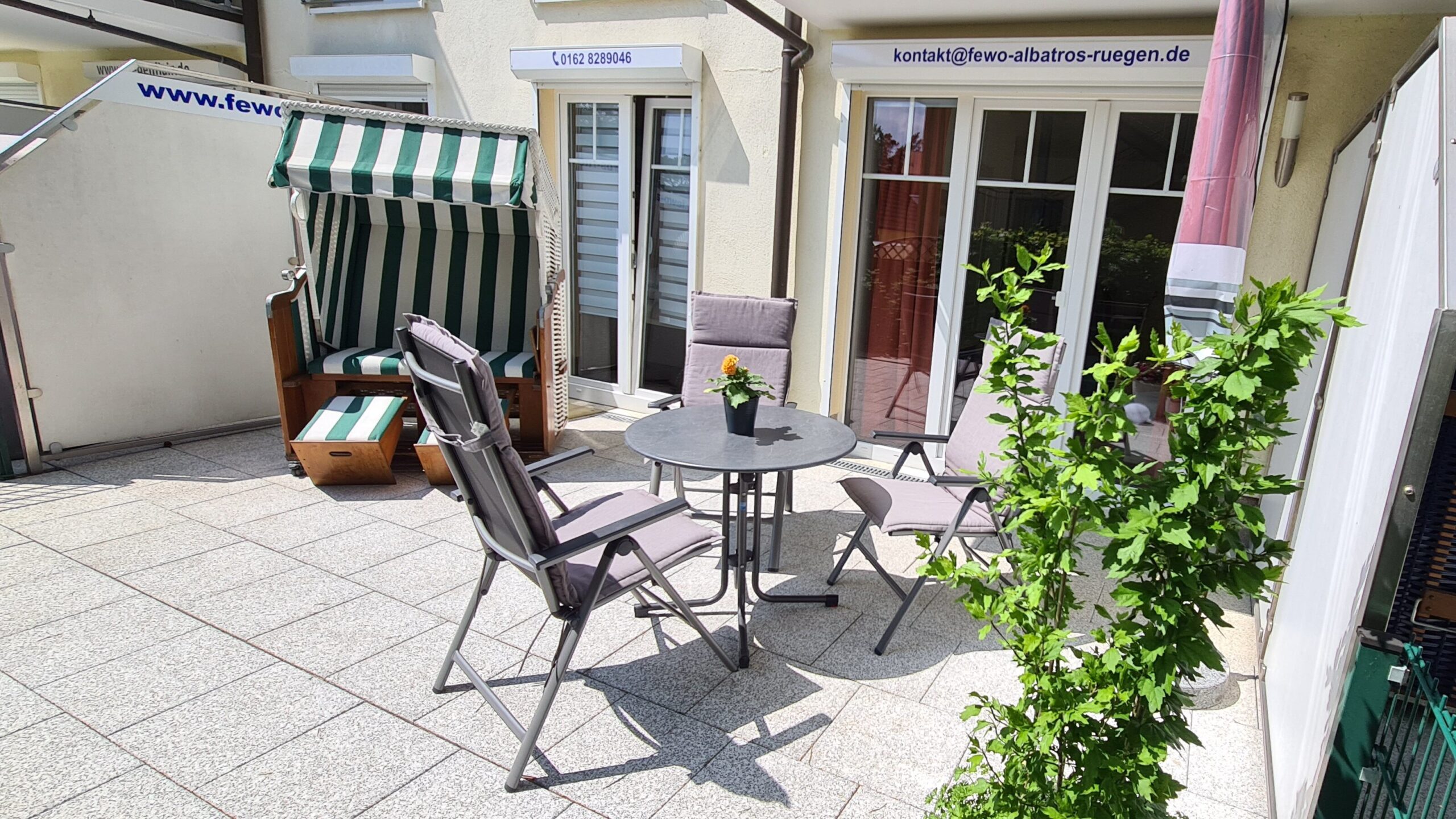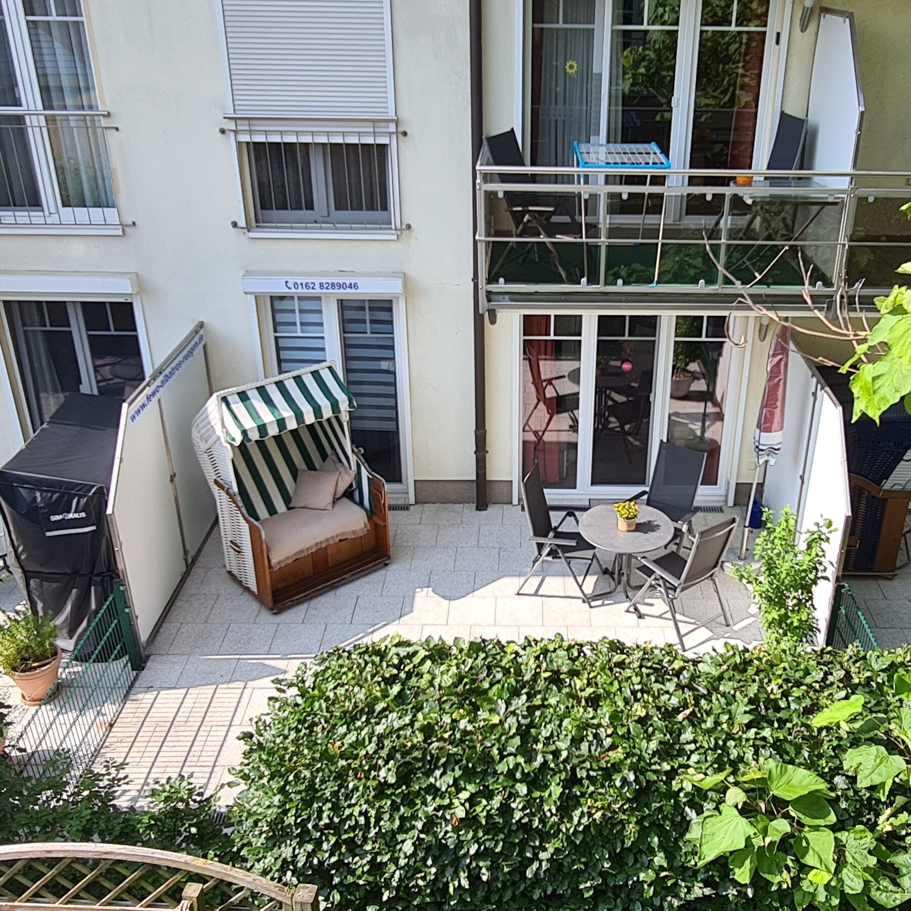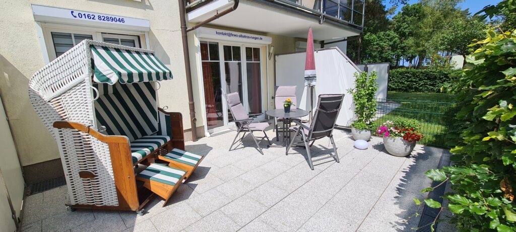 Der Außenbereich überzeugt durch die wunderschöne und große Sonnenterrasse (Südausrichtung), die Sie über das Wohn- und Schlafzimmer erreichen. Hier können Sie schöne Sommertage im wohnungseigenen Strandkorb beginnen, verbringen und ausklingen lassen. Genießen Sie gern hier Ihr leckeres Frühstück, verbringen den Tag beim Lesen eines guten Buches und lassen den Abend mit einem Glas Wein ausklingen. Die Terrasse ist rundherum eingezäunt und so ideal für Familien mit einem kleinen Kind.